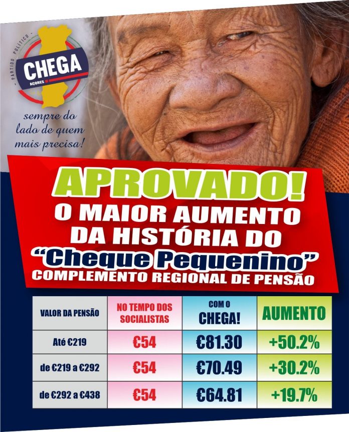 A proposta do CHEGA Açores que resulta num aumento, histórico e sem precedentes, do Complemento Regional de Pensão, o popularmente conhecido “Cheque Pequenino”, acaba de ser aprovada por unanimidade na Assembleia Legislativa Regional dos Açores.