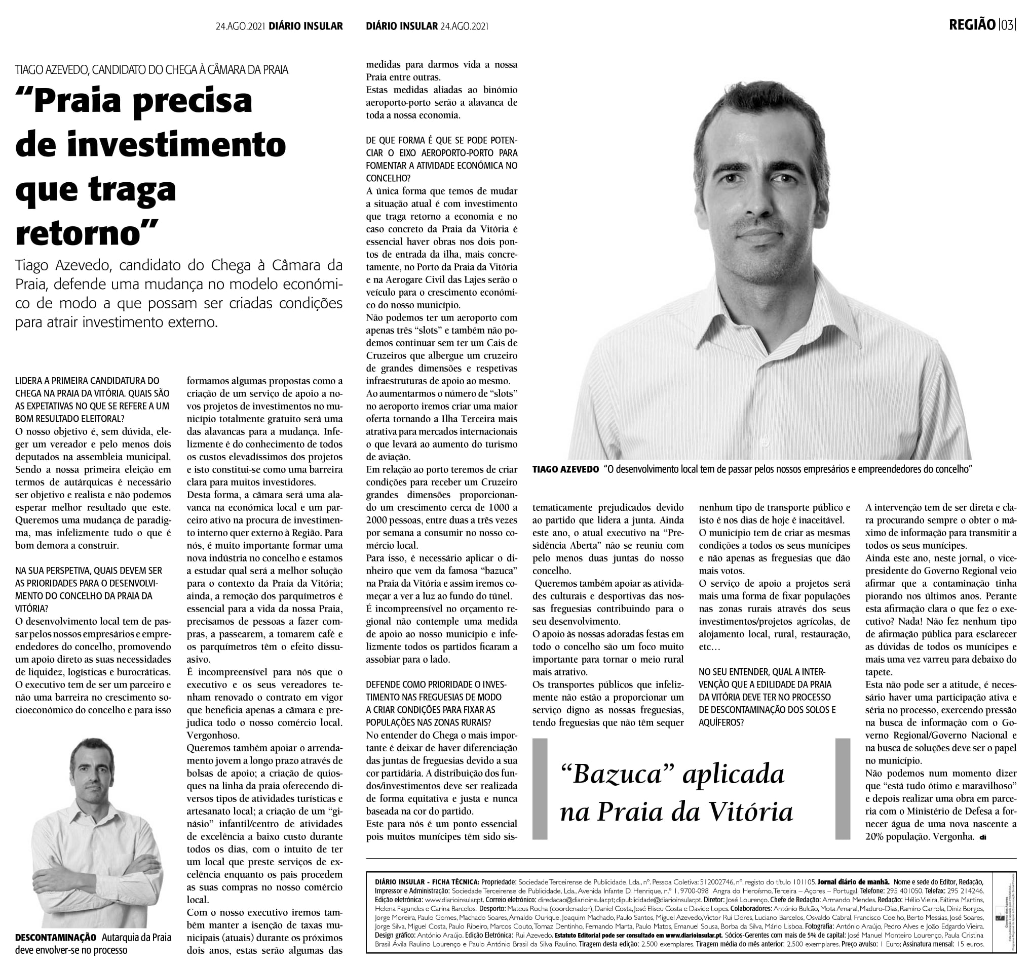 Entrevista de Tiago Azevedo, Candidato à Câmara Municipal da Praia da Vitória, pelo Chega, ao jornal Diário Insular