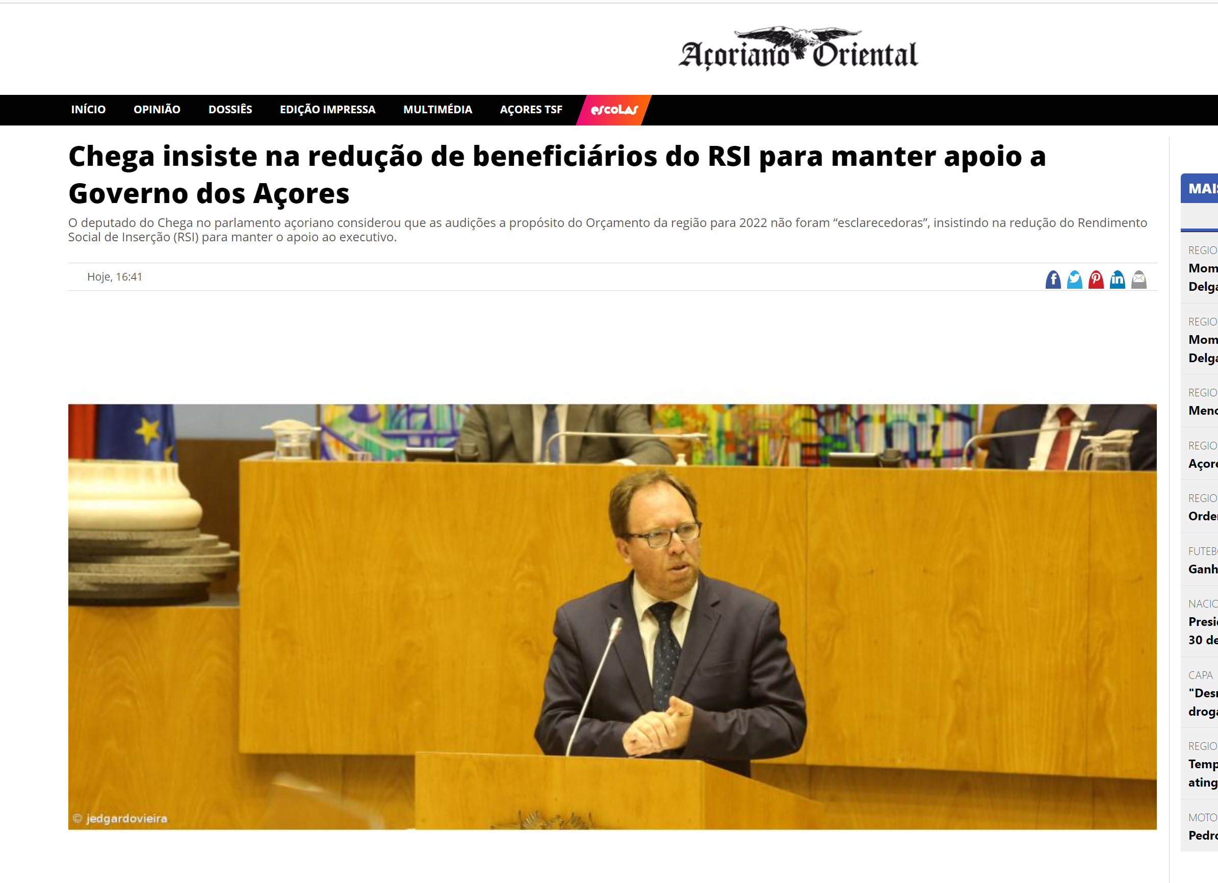 O deputado do Chega no parlamento açoriano considerou que as audições a propósito do Orçamento da região para 2022 não foram “esclarecedoras”, insistindo na redução do Rendimento Social de Inserção (RSI) para manter o apoio ao executivo.