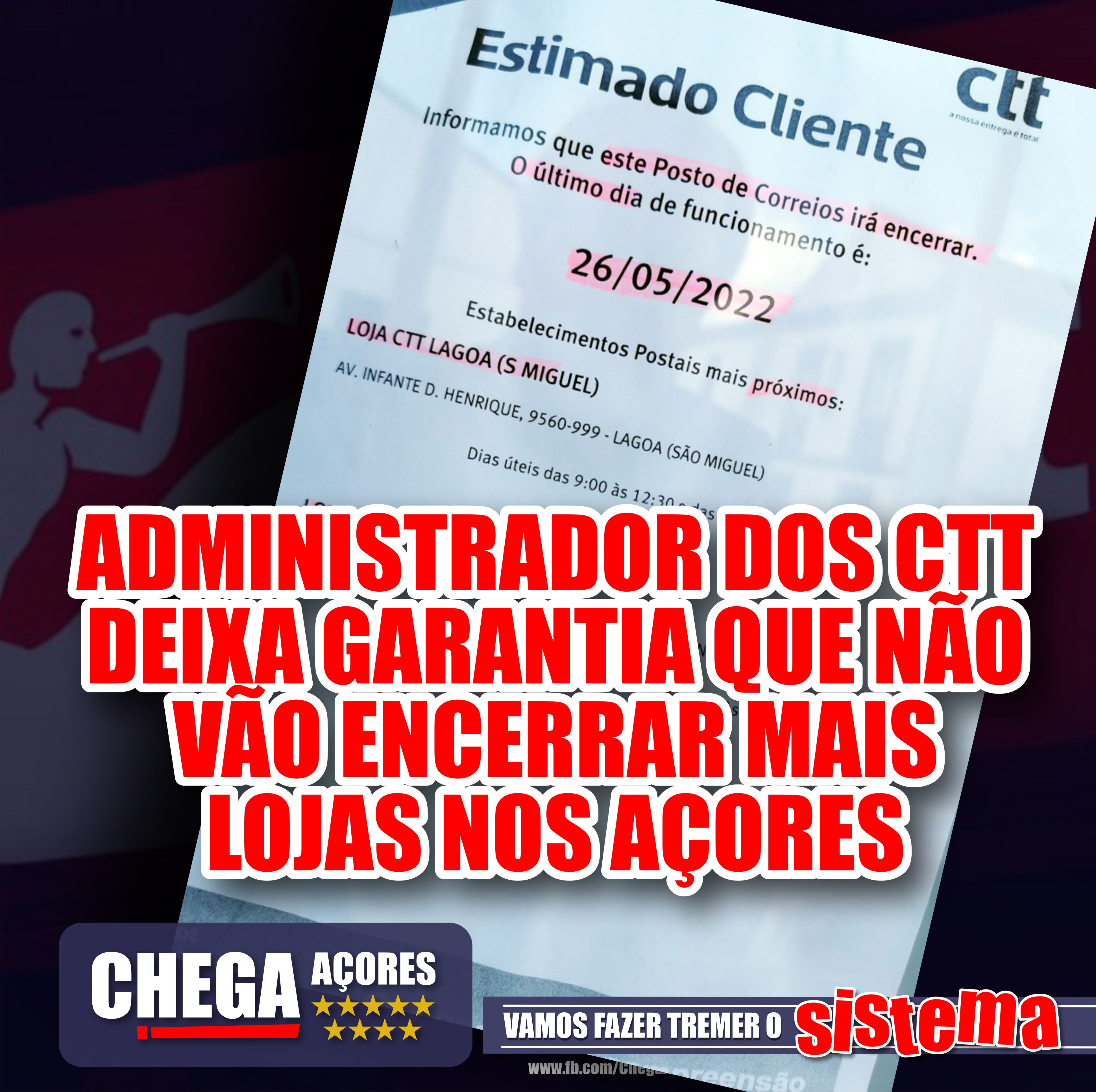 Em resposta ao deputado José Pacheco, o Administrador Executivo dos CTT referiu que não tem havido encerramento de lojas na Região e que o objectivo é reforçar a proximidade dos correios com a população. No entanto, e em concreto relativamente ao posto de correios de Água de Pau – que motivou o Projecto de Resolução do CHEGA – o aviso constante no edifício da RIAC, onde funcionaram os CTT até dia 26 de Maio, era explícito que a população deveria procurar outro posto CTT na Lagoa ou em Vila Franca do Campo, já que aquele iria encerrar.
