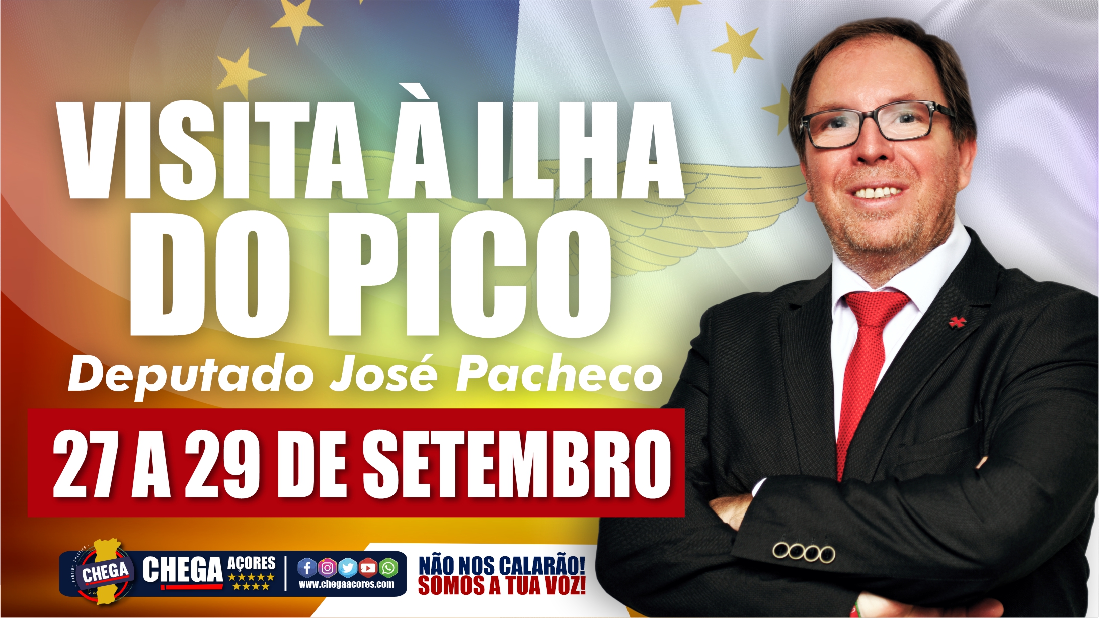 O deputado do CHEGA, José Pacheco, inicia amanhã, Quarta-feira, uma visita oficial à ilha do Pico, onde vai permanecer até Sexta-feira (dia 29 de Setembro). Nesta visita oficial, estão previstas visitas e reuniões com instituições locais, assim como encontros com a população e com militantes e simpatizantes do CHEGA.