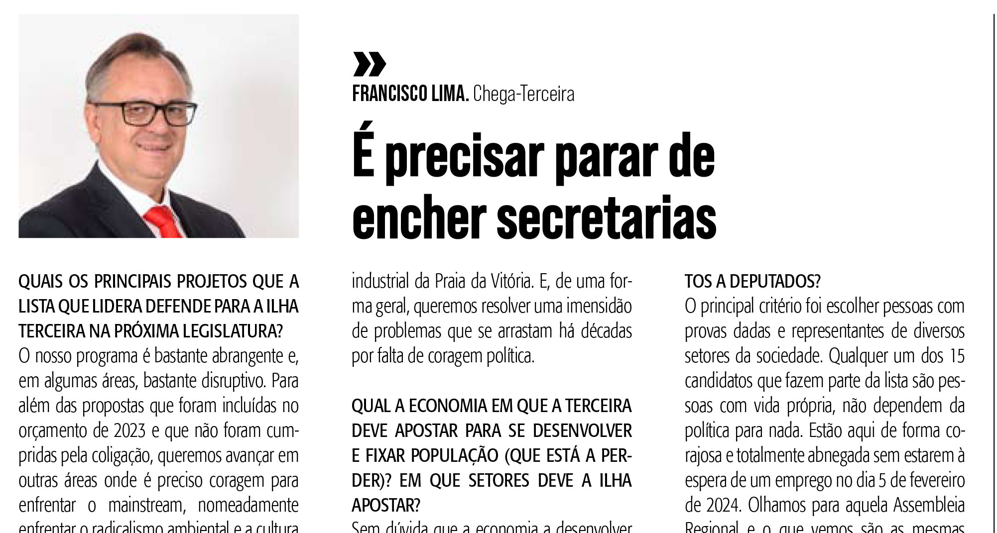 O nosso programa é bastante abrangente e, em algumas áreas, bastante disruptivo. Para além das propostas que foram incluídas no orçamento de 2023, e que não foram cumpridas pela coligação, queremos avançar em outras áreas onde é preciso coragem para enfrentar o mainstream, nomeadamente enfrentar o radicalismo ambiental e a cultura de proibicionismo ambiental que grassa nos Açores. Queremos que os agricultores possam combater as pragas de ratos e pombos sem serem perseguidos como bandidos. Queremos replantar as hortênsias na reta da Achada que foram arrancadas porque uns académicos quaisquer entenderam que é uma planta invasora. Queremos que a construção na zona costeira seja uma realidade e que se acabe com este proibicionismo bacoco em nome de sermos o bom aluno da Europa. Temos reservas nos Biscoitos e Porto Martins que só servem para criar ratos e outras pragas. Ninguém percebe como continuamos a desperdiçar esta enorme riqueza que é a pequena construção à beira-mar. Queremos desenvolver o Hidrotermalismo na Terceira. Queremos travar as reservas marítimas que empurram os pescadores para a miséria. Queremos expandir a zona industrial da Praia da Vitória. E, de uma forma geral, queremos resolver uma imensidão de problemas que se arrastam há décadas por falta de coragem política.