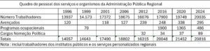 O CHEGA, ciente desta realidade, questionou o Governo Regional sobre os dados históricos referentes ao número de trabalhadores em funções públicas. Era esperado que tivesse havido um crescimento desde 1996 (começo dos Governos do PS nos Açores), só que não era esperado que os números fossem tanto “avassaladores”. Eis abaixo um quadro-resumo. (Imagem 1)