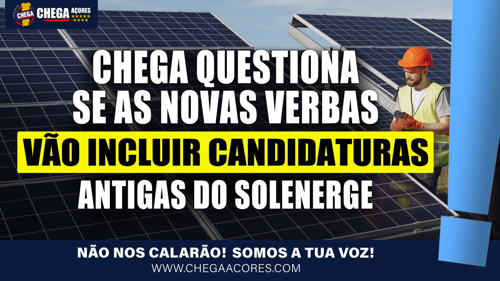 O CHEGA enviou hoje um requerimento à Assembleia Legislativa Regional questionando se a reprogramação de verbas do Plano de Recuperação e Resiliência (PRR) – alocadas para o programa SOLENERGE – vai abranger as candidaturas anteriormente apresentadas e sem resposta.