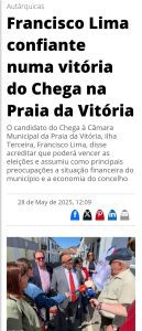 Nas eleições legislativas nacionais, o Chega ficou em terceiro lugar no concelho da Praia da Vitória, com 21,36% dos votos, segundo os resultados provisórios, mas Francisco Lima disse estar confiante num resultado superior nas autárquicas.