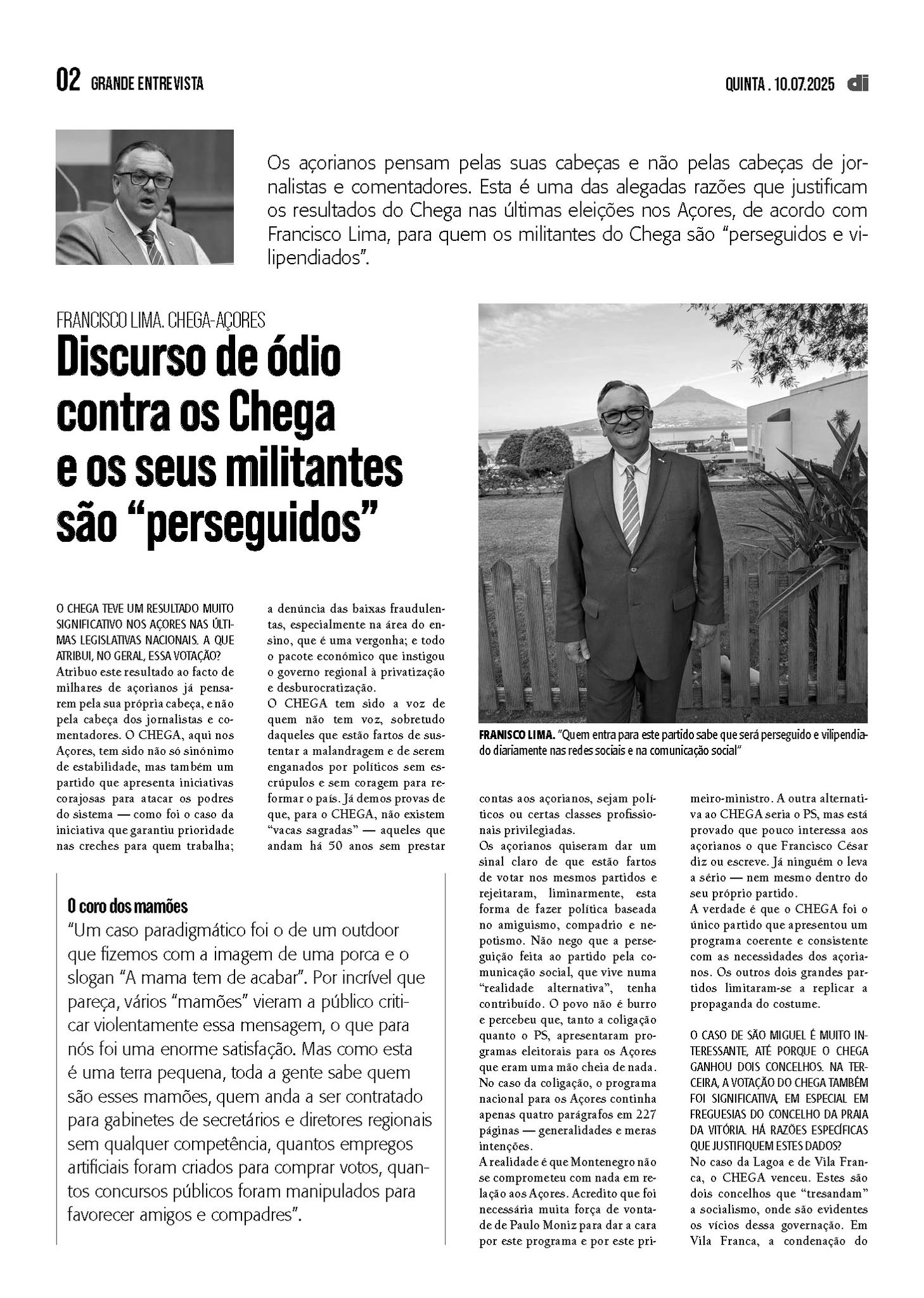 No entanto, eu próprio sou candidato à Câmara Municipal da Praia da Vitória e acredito que há condições para o CHEGA alcançar um resultado histórico — ou até mesmo ganhar a Câmara e a Assembleia Municipal. É já uma certeza que, nestas eleições autárquicas, o CHEGA vai crescer em relação às anteriores — disso, já ninguém duvida. O apoio que sentimos nas ruas é avassalador.