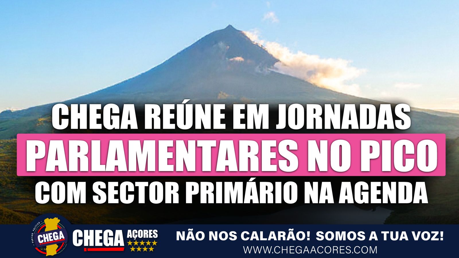 O Grupo Parlamentar do CHEGA Açores vai reunir em Jornadas Parlamentares no próximo fim-de-semana, na ilha do Pico, onde vai manter contactos com vários agentes do sector primário e contactar directamente com a população, como tem sido habitual do CHEGA.